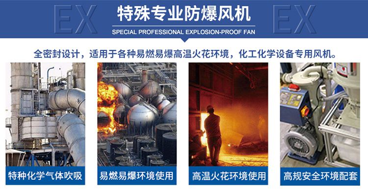 防爆風機是風機中的一種特殊類型,它是用在有易燃易爆的場所,常用的行業為石油、化工等。它主要的就是隔離風機啟動、運行過程中,電機接線端子、定轉子或其它部件產生的火花不與外界易燃易爆性的氣體接觸而引發安全事故的發生。 防爆風機主要用于工廠、煤礦井下、隧道爐、石油天然氣、石油化工和化學工業、鋼鐵冶金設備、鍋爐加工房、城市煤氣、交通運輸、糧油加工、玻璃工業、在紡織廠、造紙機械設備、煙火炮竹,特殊場所,制藥廠等部門也被廣泛應用。